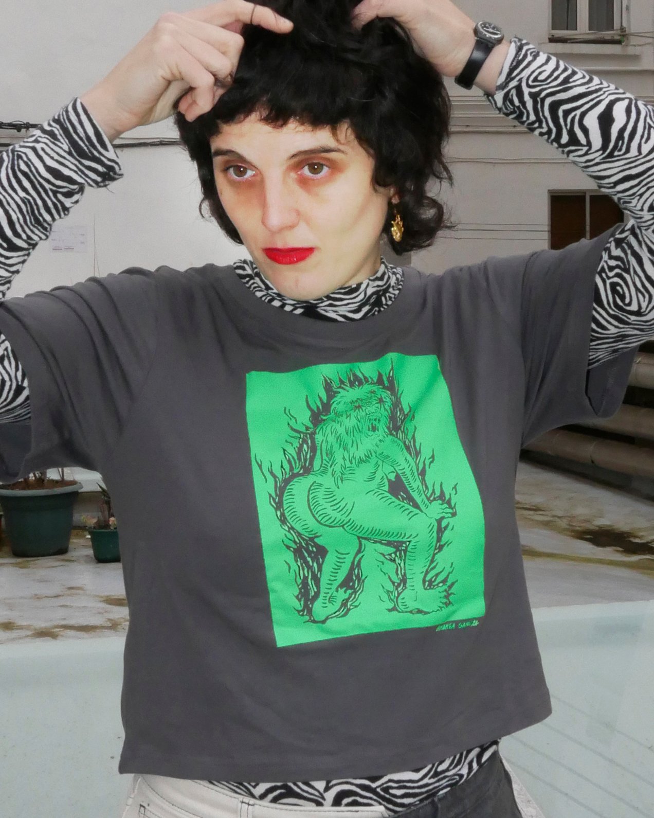 2. Camiseta GRIS CROP-TOP. 95% algodón 5% elastano. 180gr. Corta y holgada de mangas ajustadas.