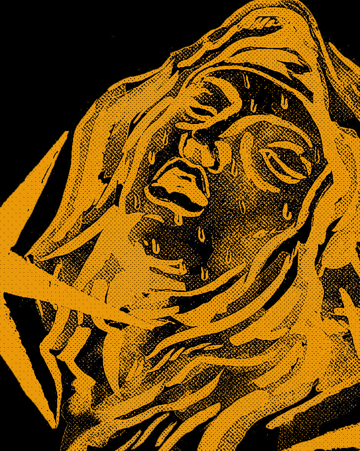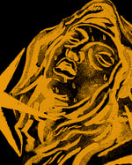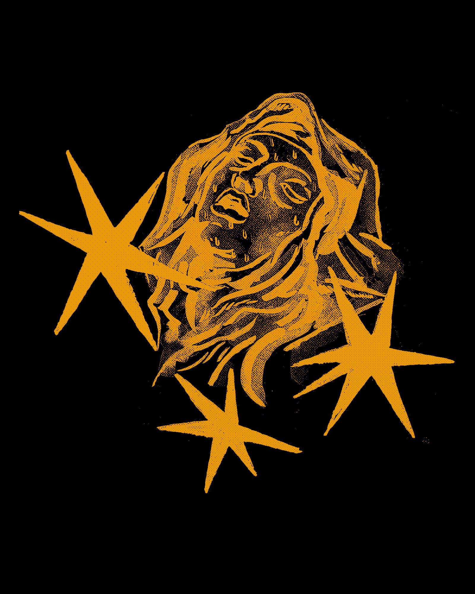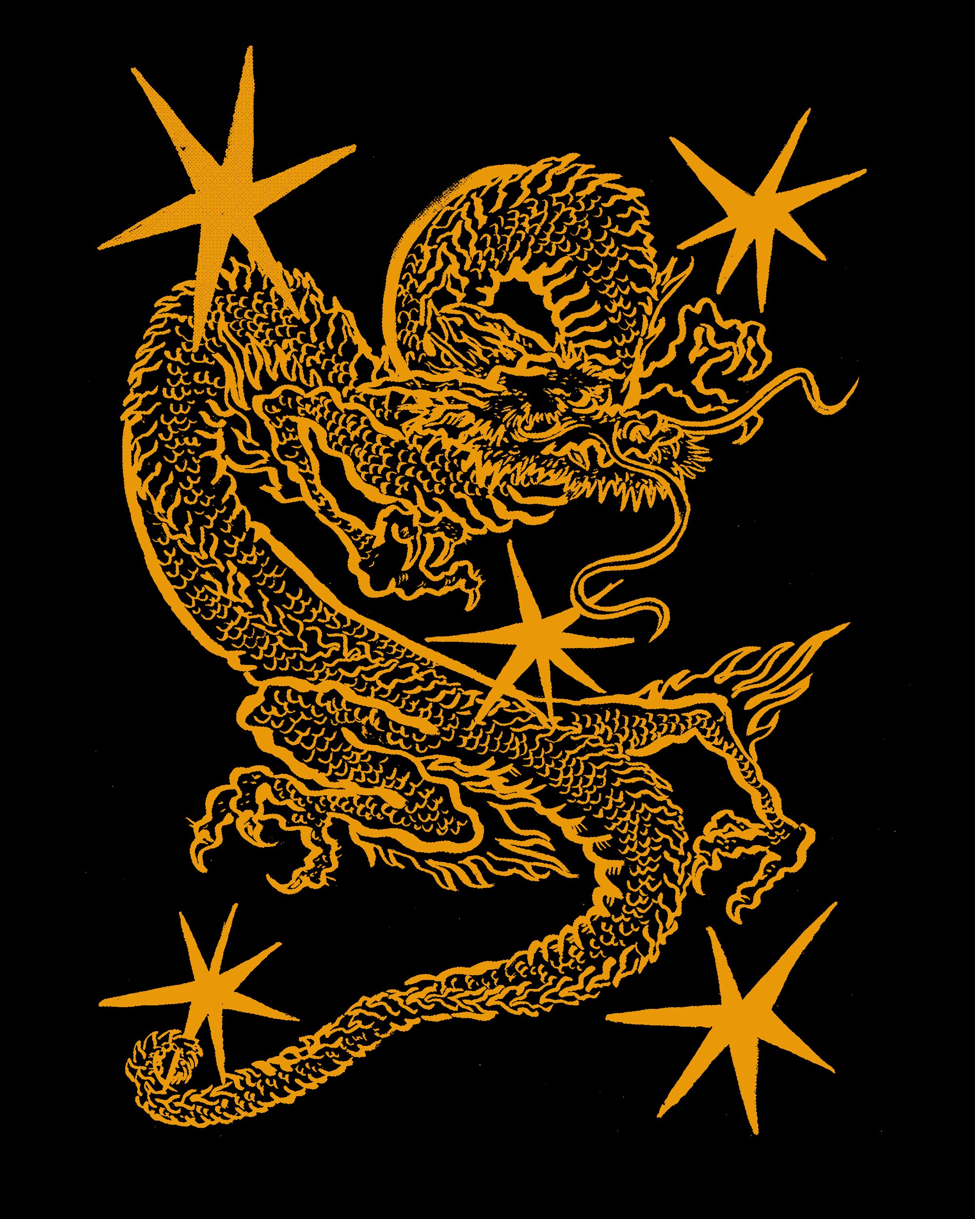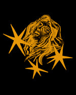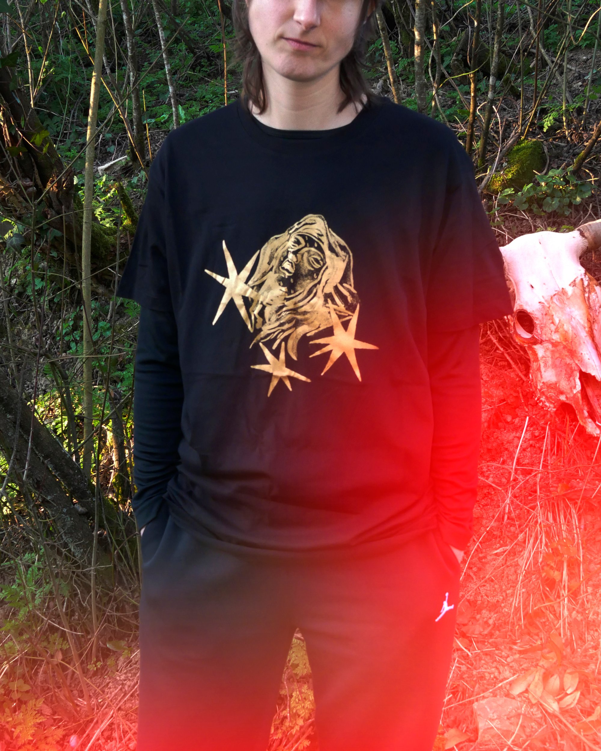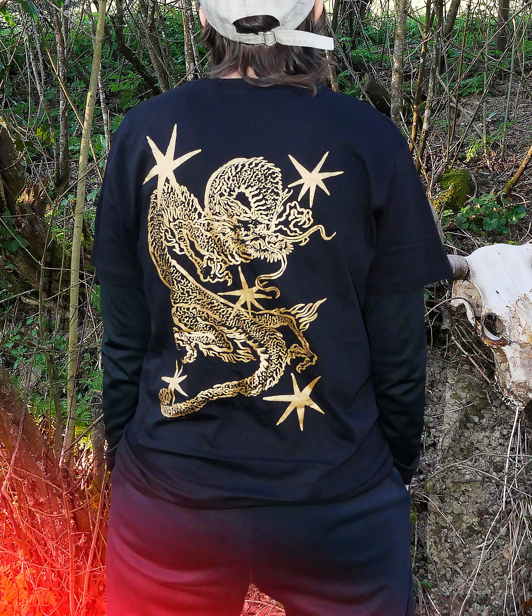 2 estampas tinta dorada sobre camiseta negra.