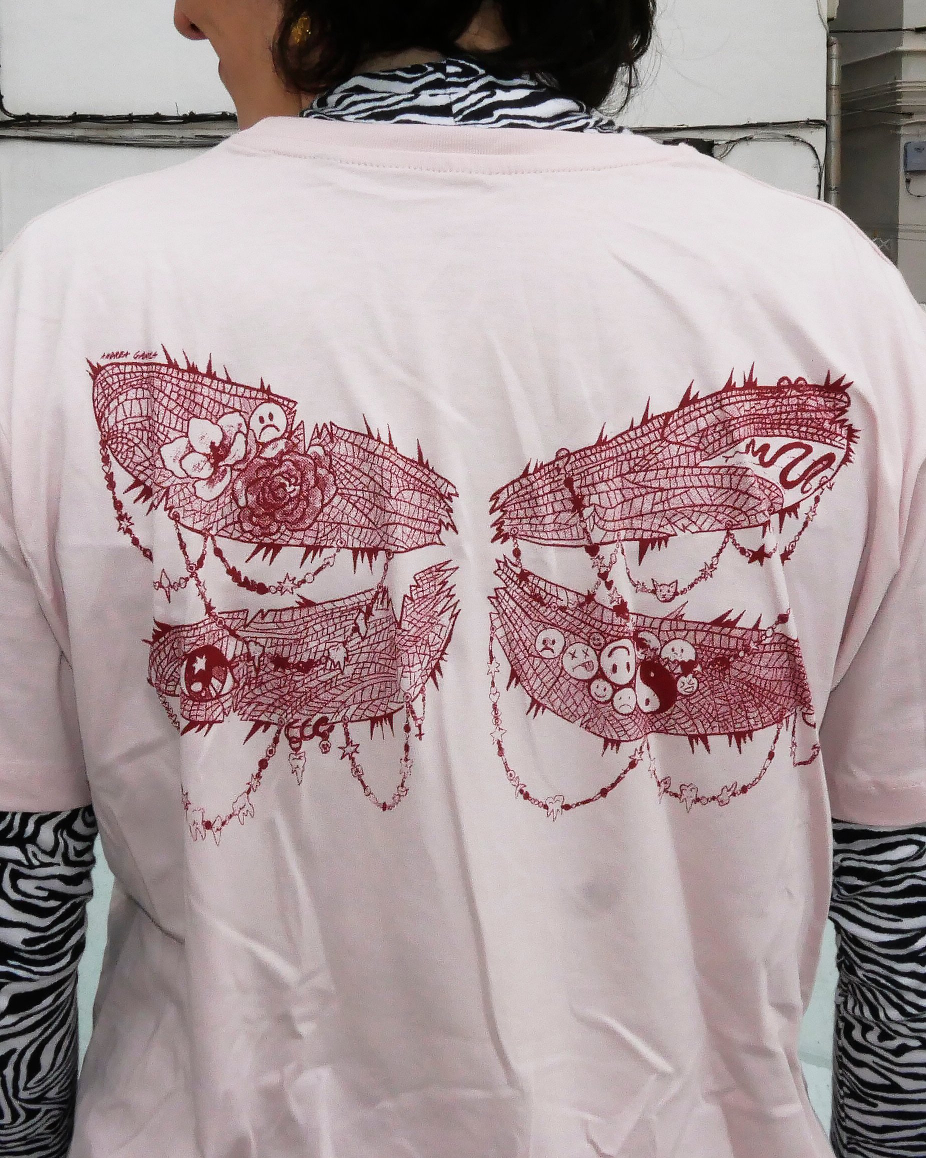 De ahí sale esta camiseta con dos estampas, una frontal sacada de un grabado en punta seca y una trasera que no hace más que darte unas alas para que vueles bien alto y sin límites, ¡cómo la mismísima Jun!