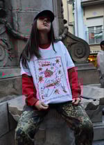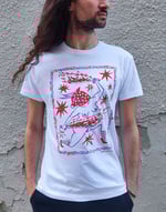 Serigrafía a dos tintas, rojo y púrpura, sobre camiseta B&C algodón orgánico 100%.